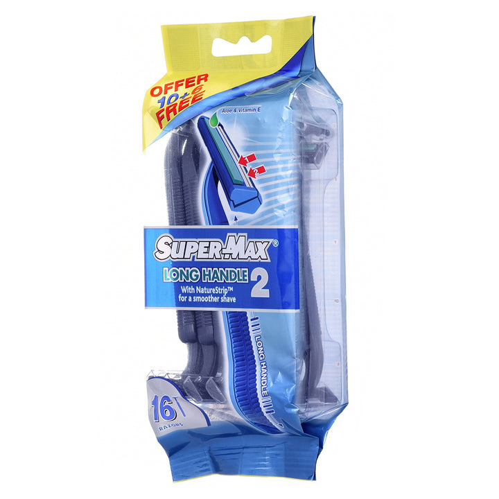 شفرات حلاقة سوبر ماكس للرجال للاستخدام مرة واحدة بمقبض طويل وشفرة مزدوجة - 10+6 قطع