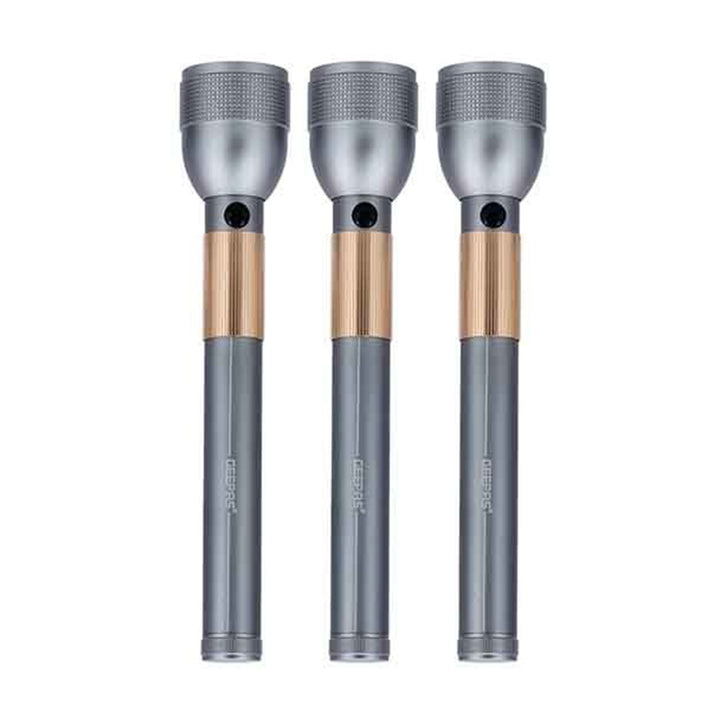 The Geepas GFL-51079 set includes 3 rechargeable LED flashlights designed for outdoor and emergency use. Built with durable aluminum bodies and equipped with 7W LED lights, these flashlights deliver consistent brightness with up to 4 hours of working time. Powered by a 3.7V 4000mAh Li-Ion battery, they are waterproof and ideal for trekking, camping, roadside emergencies, and more.