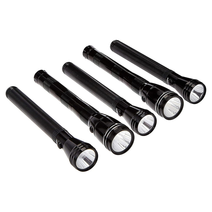 The Sanford SF6201SLC 5 in 1 Rechargeable LED Searchlight set delivers powerful illumination with unmatched durability. Each torch in this combo features a hyper bright 3W CREE LED offering a beam range of up to 1600 meters and 120–140 lumens brightness. Designed for long-lasting use, the flashlights are equipped with a 1900mAh rechargeable lithium battery that provides up to 240 minutes of continuous operation. Built with corrosion, water, and shock resistance, and backed by a lifetime warranty on the CREE LED, this set is ideal for outdoor adventures, home use, and emergency preparedness.